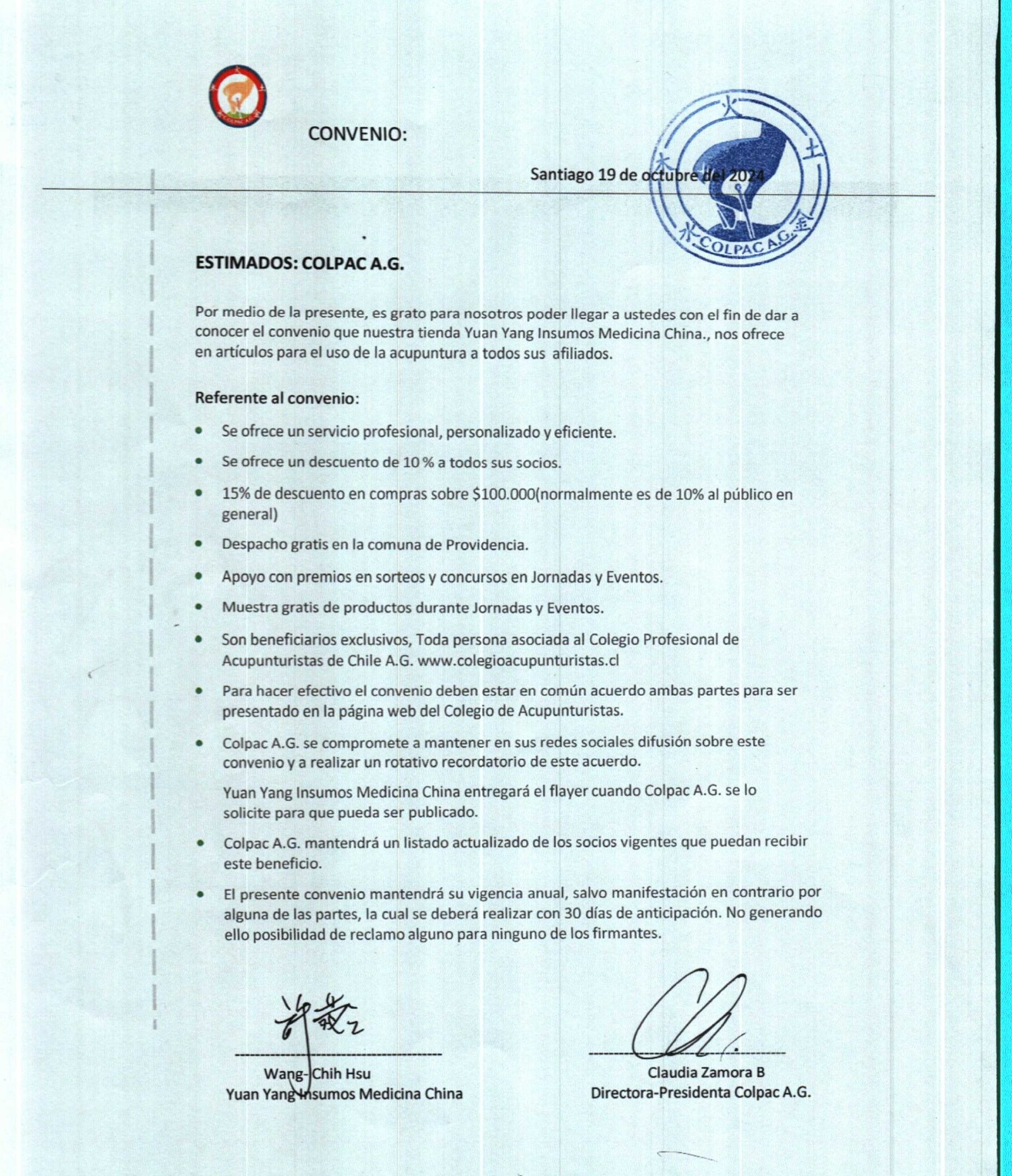 • Colpac A.G. se compromete a mantener en sus redes sociales difusión sobre este convenio y a realizar un rotativo recordatorio de este acuerdo. Yuan Yang Insumos Medicina China entregará el flayer cuando Colpac A.G. se lo solicite para que pueda ser publicado.